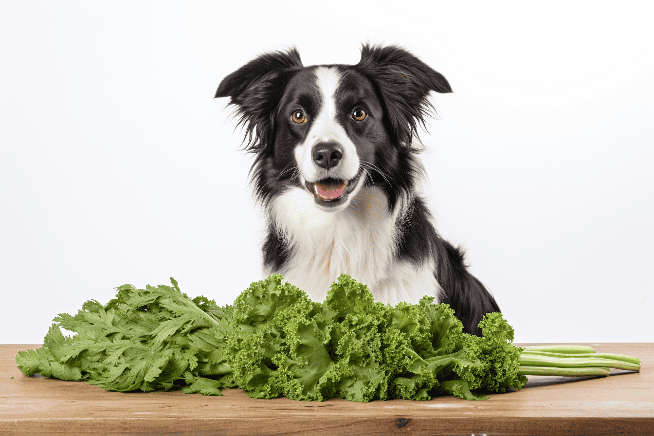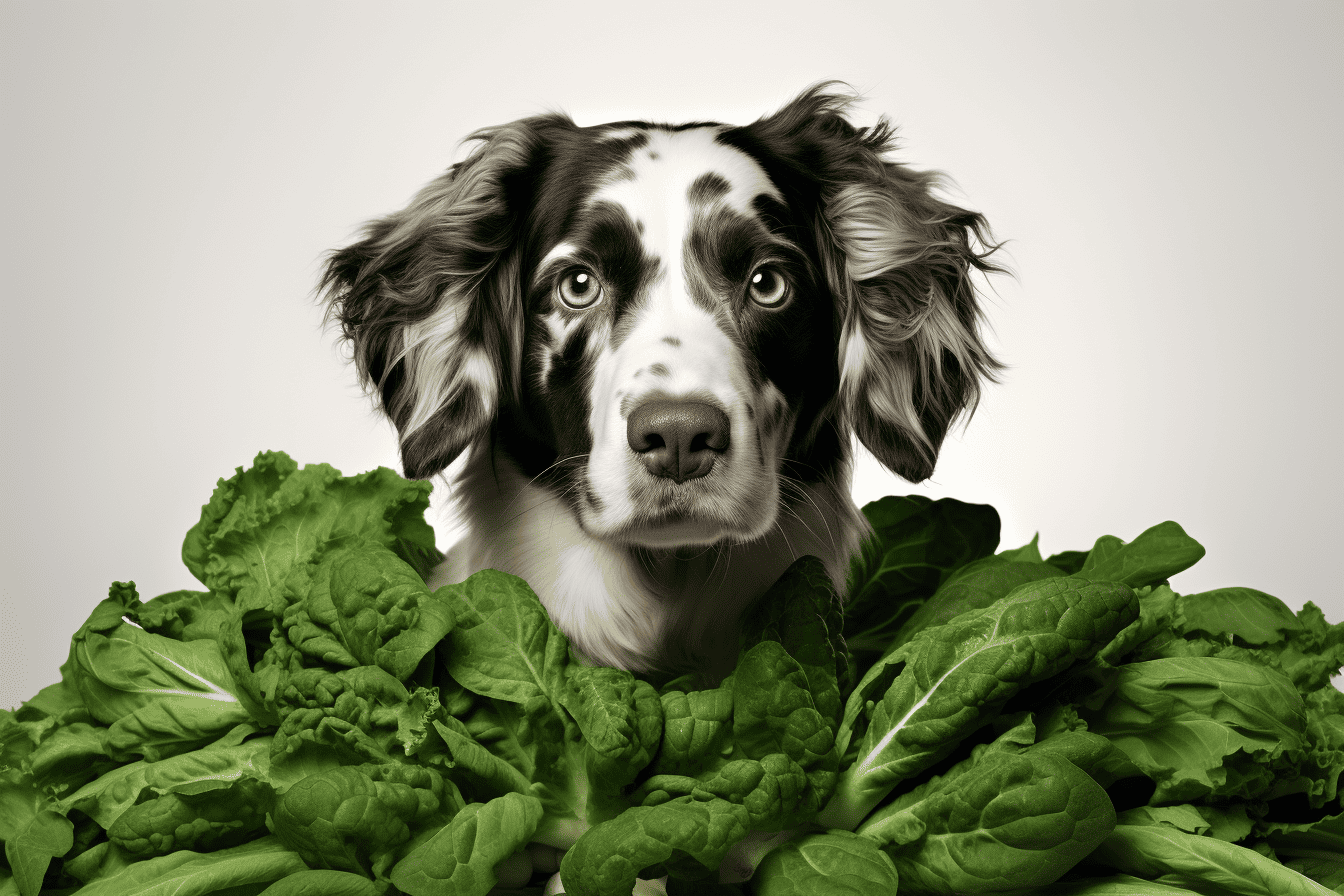 Dog eating fresh green leafy vegetables for a nutritious diet.